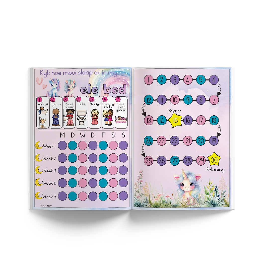 Hierdie pakket bevat `n slaaptyd roetine, sowel as spasies om af te merk wanneer `n takie voltooi is.