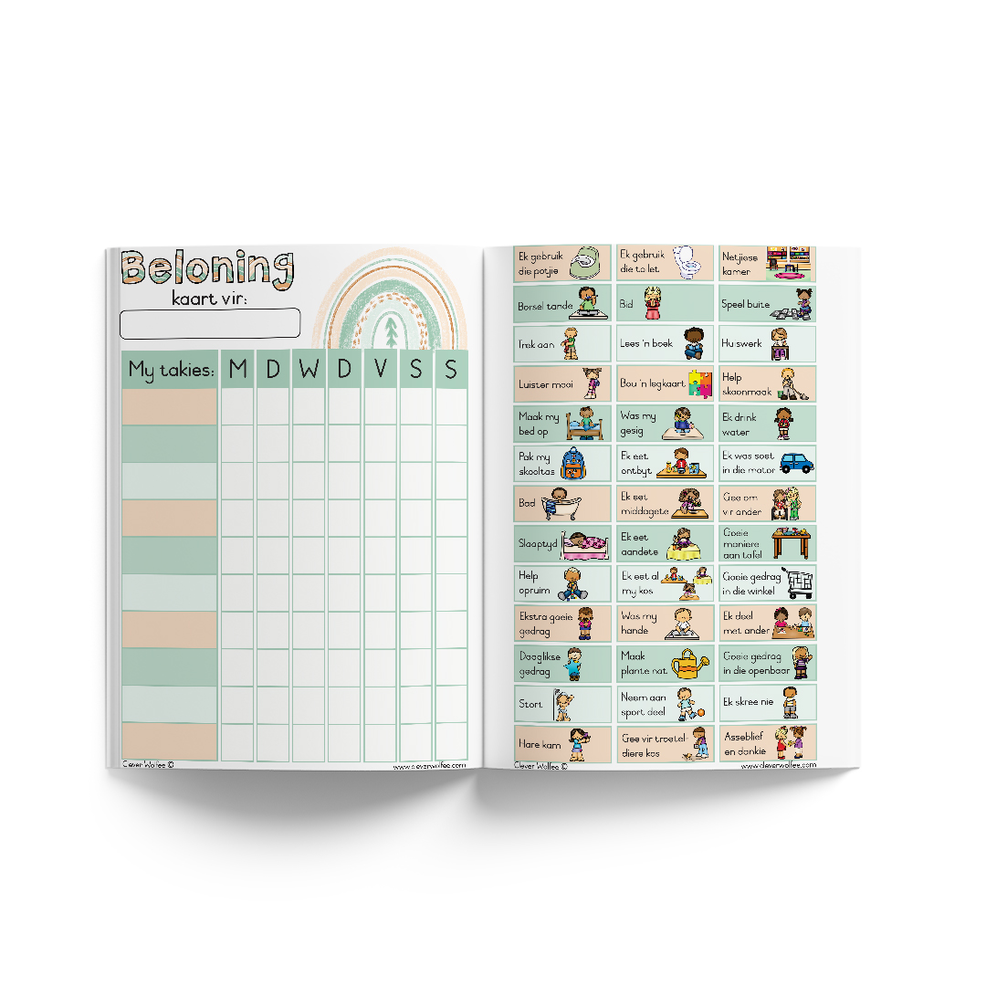 Bladsy 3: ‘n Kaart met 30 kolle. Hierdie kaart kan saam met bladsy 1 gebruik word om die kind te beloon.