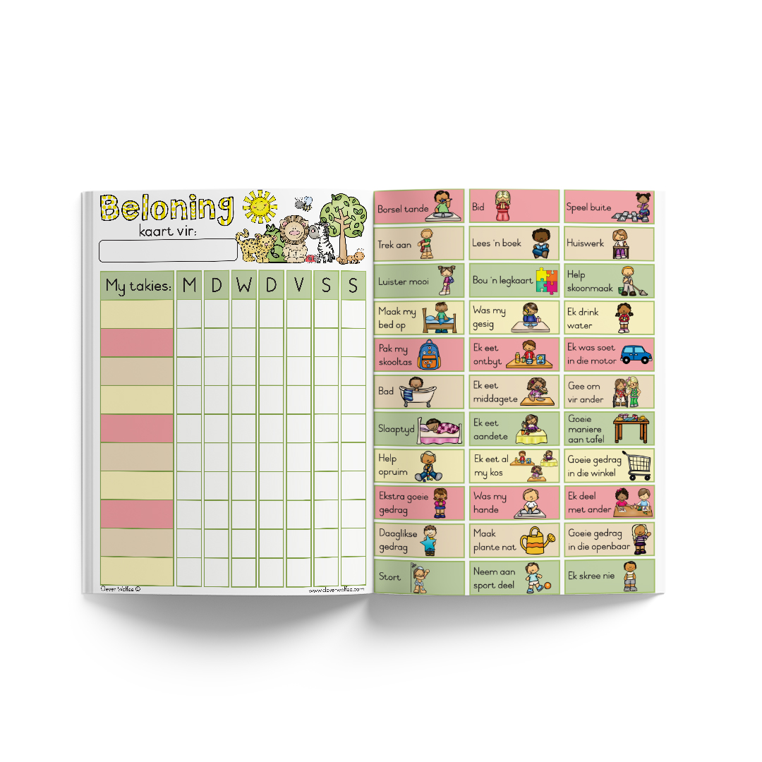 Bladsy 3: ‘n Kaart met 30 kolle. Hierdie kaart kan saam met bladsy 1 gebruik word om die kind te beloon.