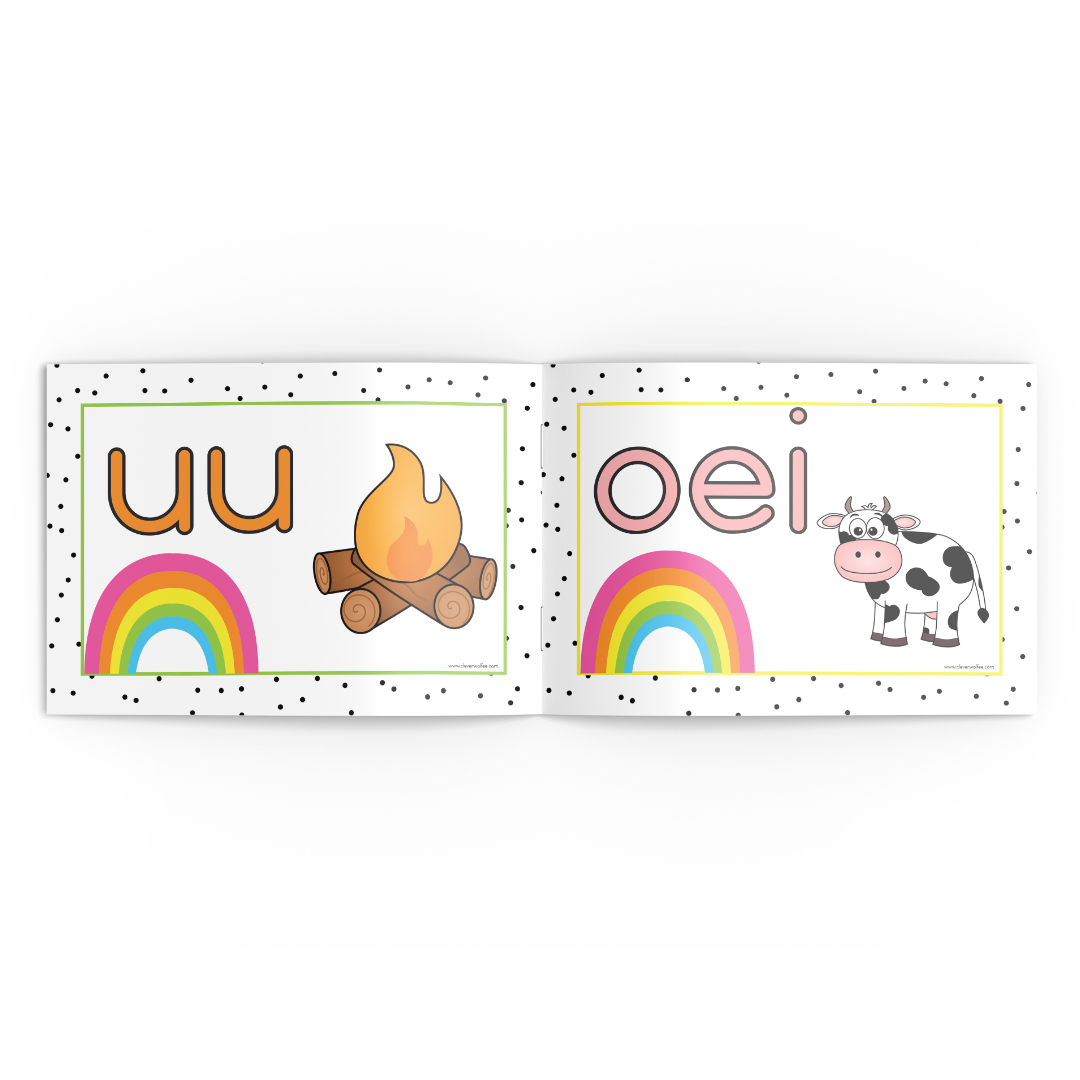 8 Pragtige plakkate met die volgende klanke: oo, ie, eu, uu, aa, ee, oe, ou, ui, ei, aai, ooi, oei, eeu