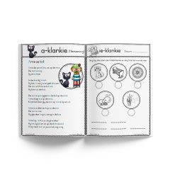 – Die a, e, i, o, u, y klankies het elkeen 8 verskillende werkkaarte om die klankies vas te lê.