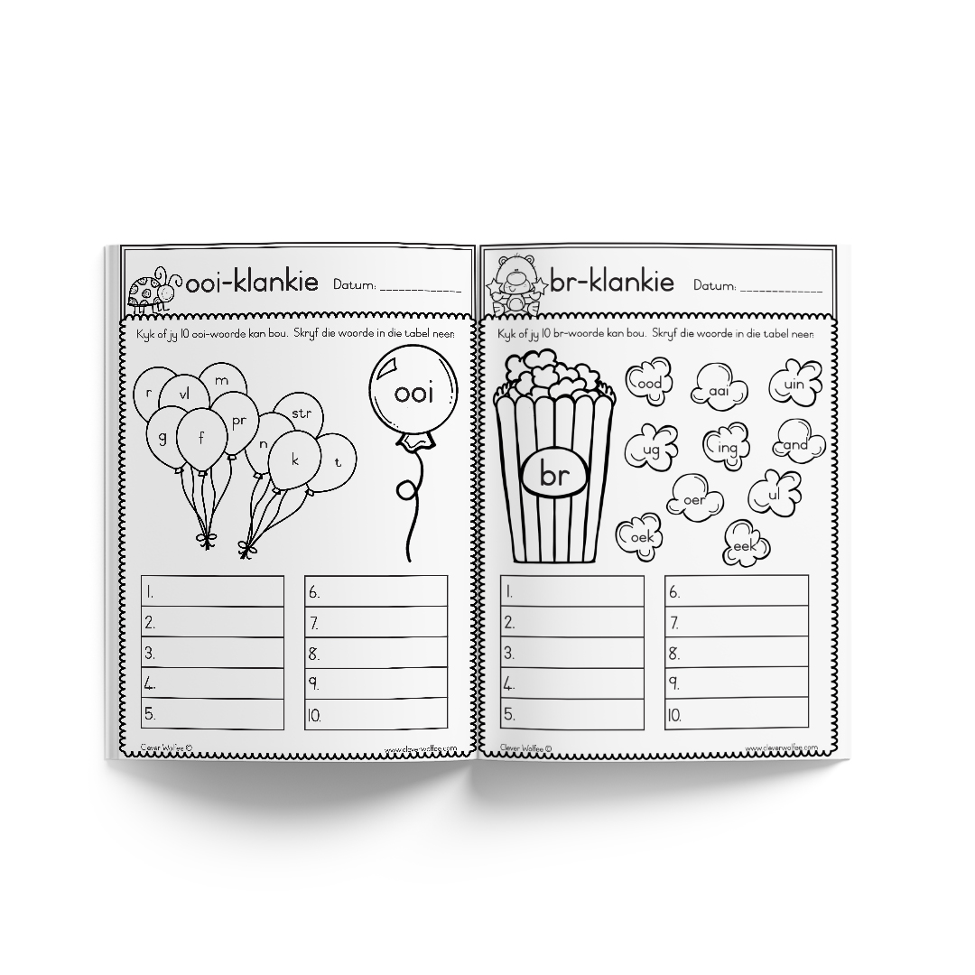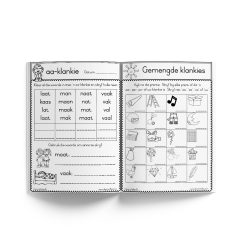 – Die aa, ee, oo, uu, ou, ie, ei, ui, eu, oe klankies het elkeen 7 verskillende werkkaarte om die klankies vas te lê.