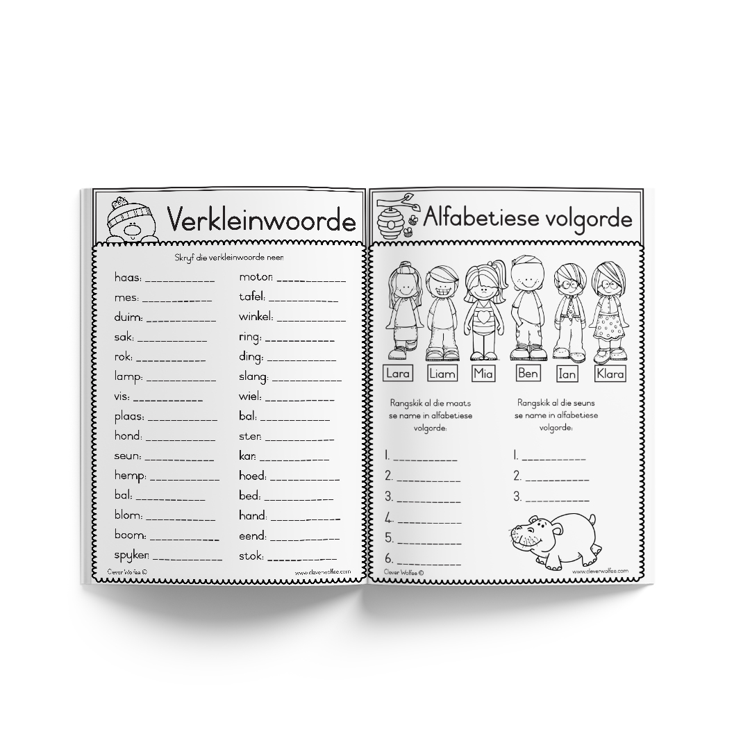 – Die alfabet (oefen om elke letter te skryf – hoofletter en kleinletter)