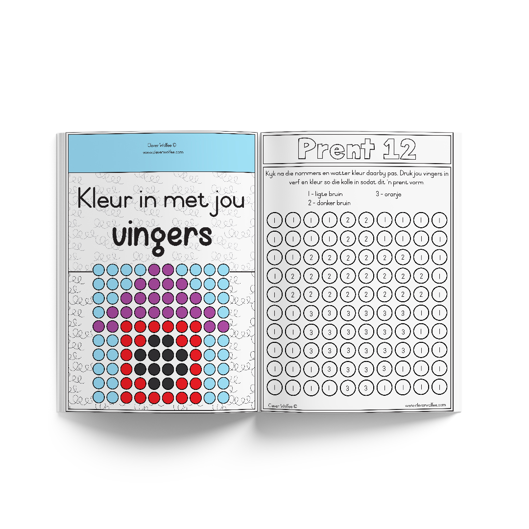 Hierdie boekie het 15 bladsye en fokus daarop om in te kleur volgens ‘n kode.