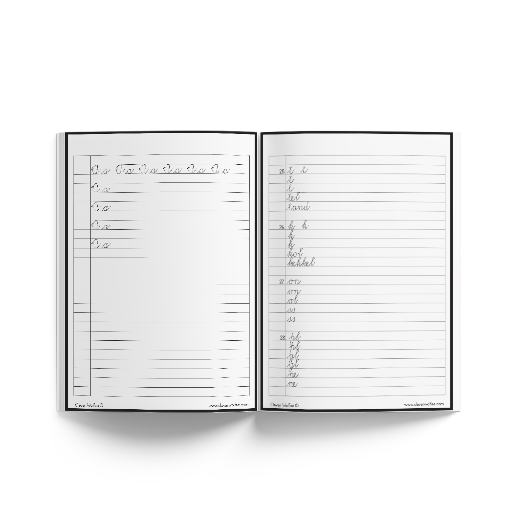 Hierdie boekie het 35 bladsye en het baie oulike oefeninge in vir leerders wat vir die eerste keer met lopende skrif begin.