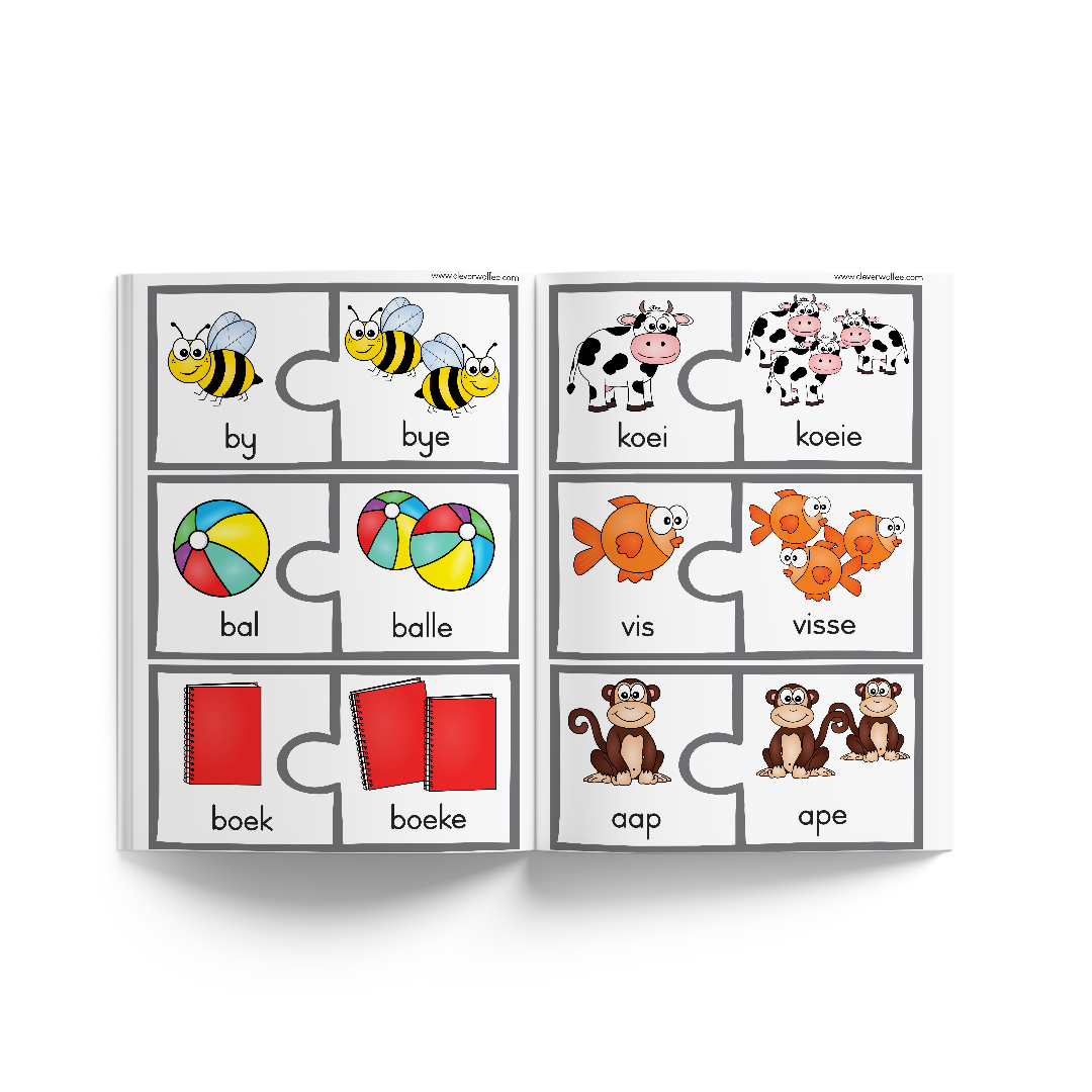 Hierdie boekie het 15 bladsye met 3 legkaarte op elke bladsy.