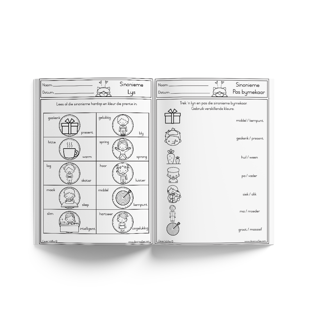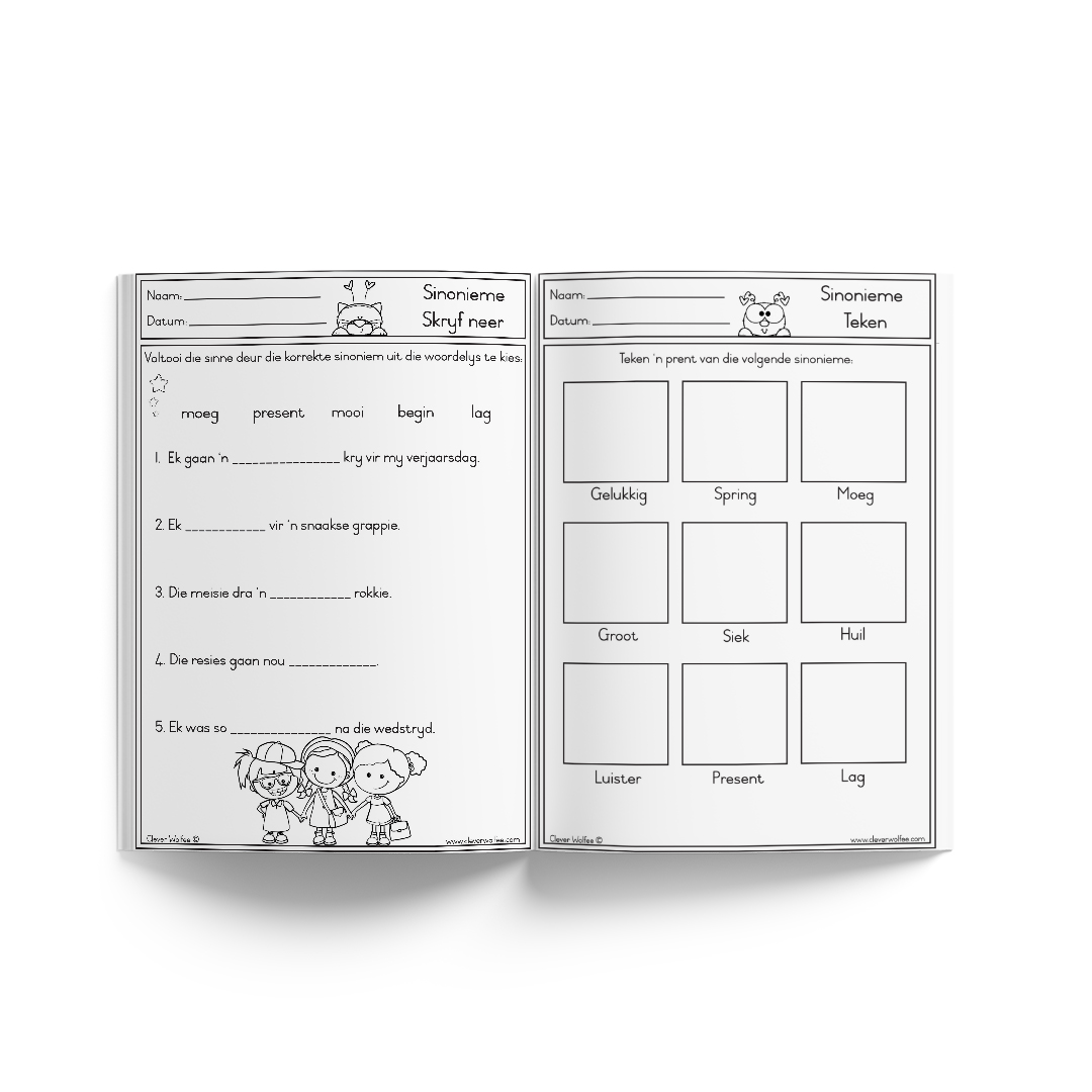 Ons nuwe Afrikaans Huistaal hulpbron bestaan uit tien bladsye, wat vir leerders leer oor sinonieme.