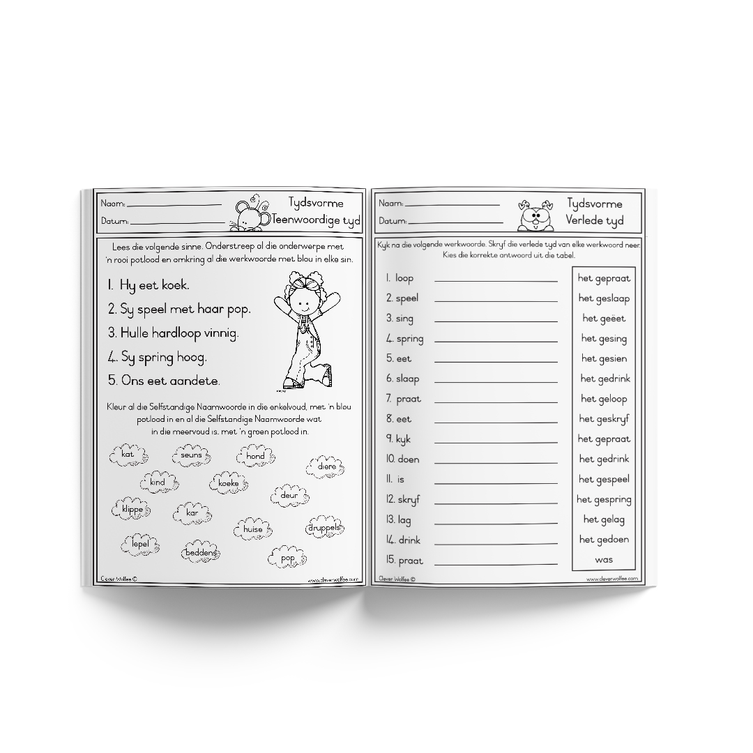 Hierdie Afrikaans Huistaal boekie bestaan uit 12 bladsye wat die volgende tydsvorme insluit: