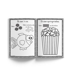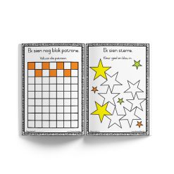 60 Bladsye vol aktiwiteite om patrone te oefen, asook woorde om te herken.