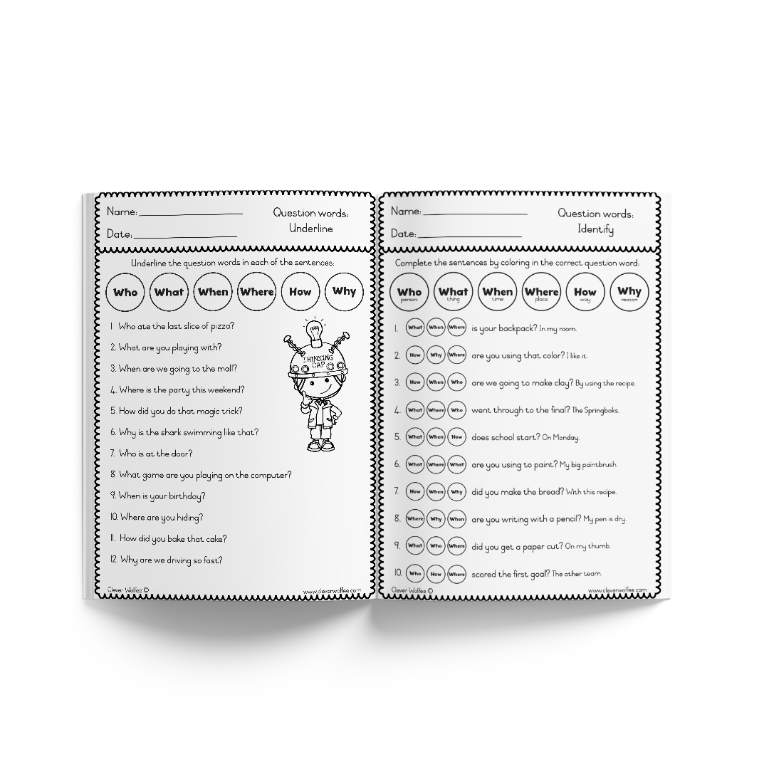 This book includes 10 fun-filled pages of activities to improve and practise the child’s ability to use question words, such as: