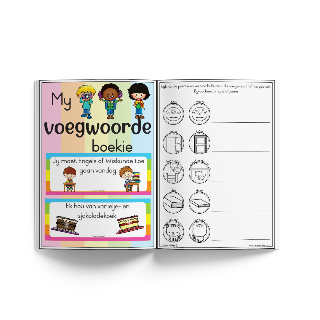 Hierdie boekie het 14 bladsye en 12 (en, of, maar en daarom) verskillende voegwoorde.