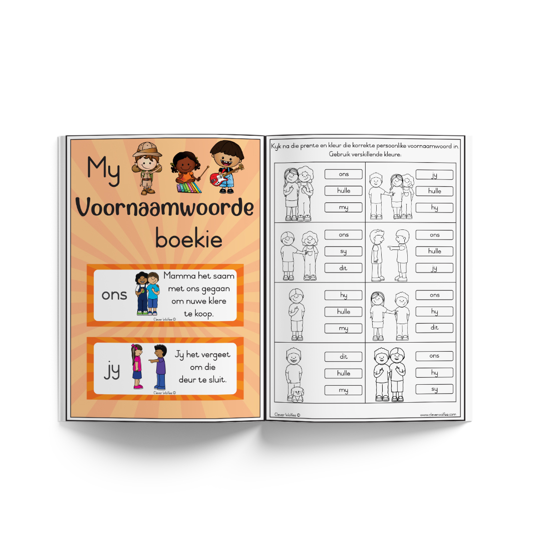 Hierdie boekie bestaan uit 30 bladsye en bevat verskillende voornaamwoorde.