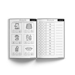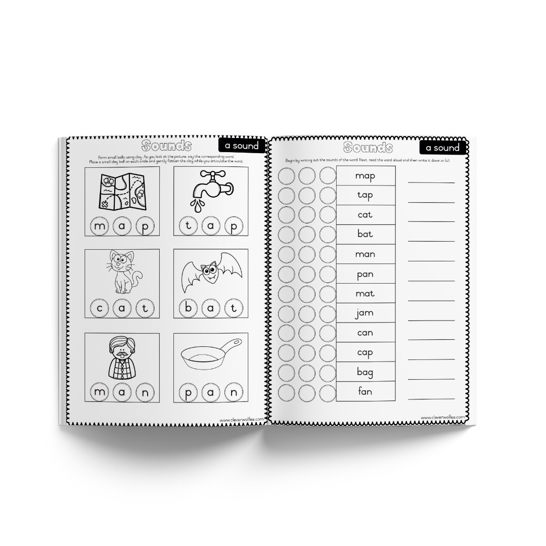 This fun, hands-on booklet combines fine-motor play with phonics practice – perfect for building sound awareness and early spelling confidence. Children roll small playdough balls and place them on each circle as they say the sounds of the words aloud.
