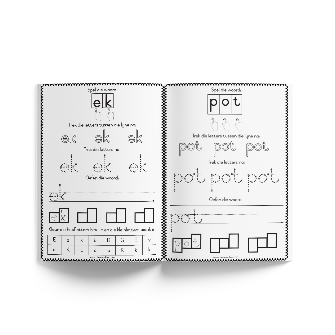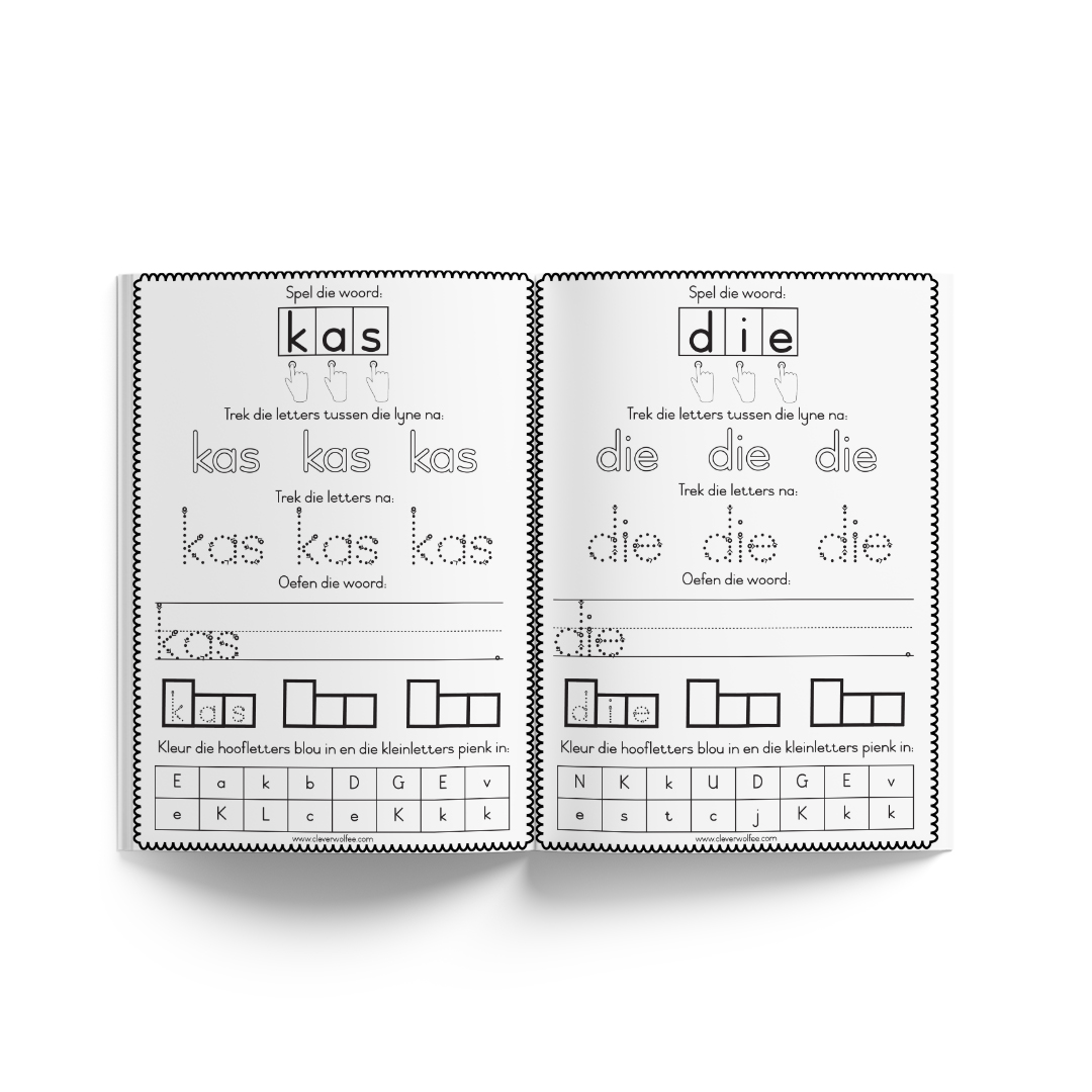 Elke woord het ‘n paar aktiwiteite, onder andere spel die woord, trek die letters na, skryf die woord, oefen hoofletters en kleinletters.