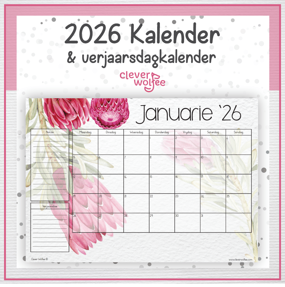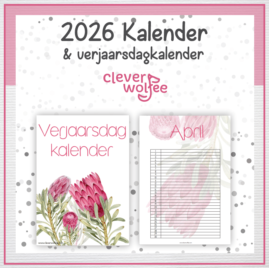 In die pakket is ook ‘n verjaarsdagkalender (12 bladsye) in A4 ontwerp om al daardie belangrike datums vas te vang.
