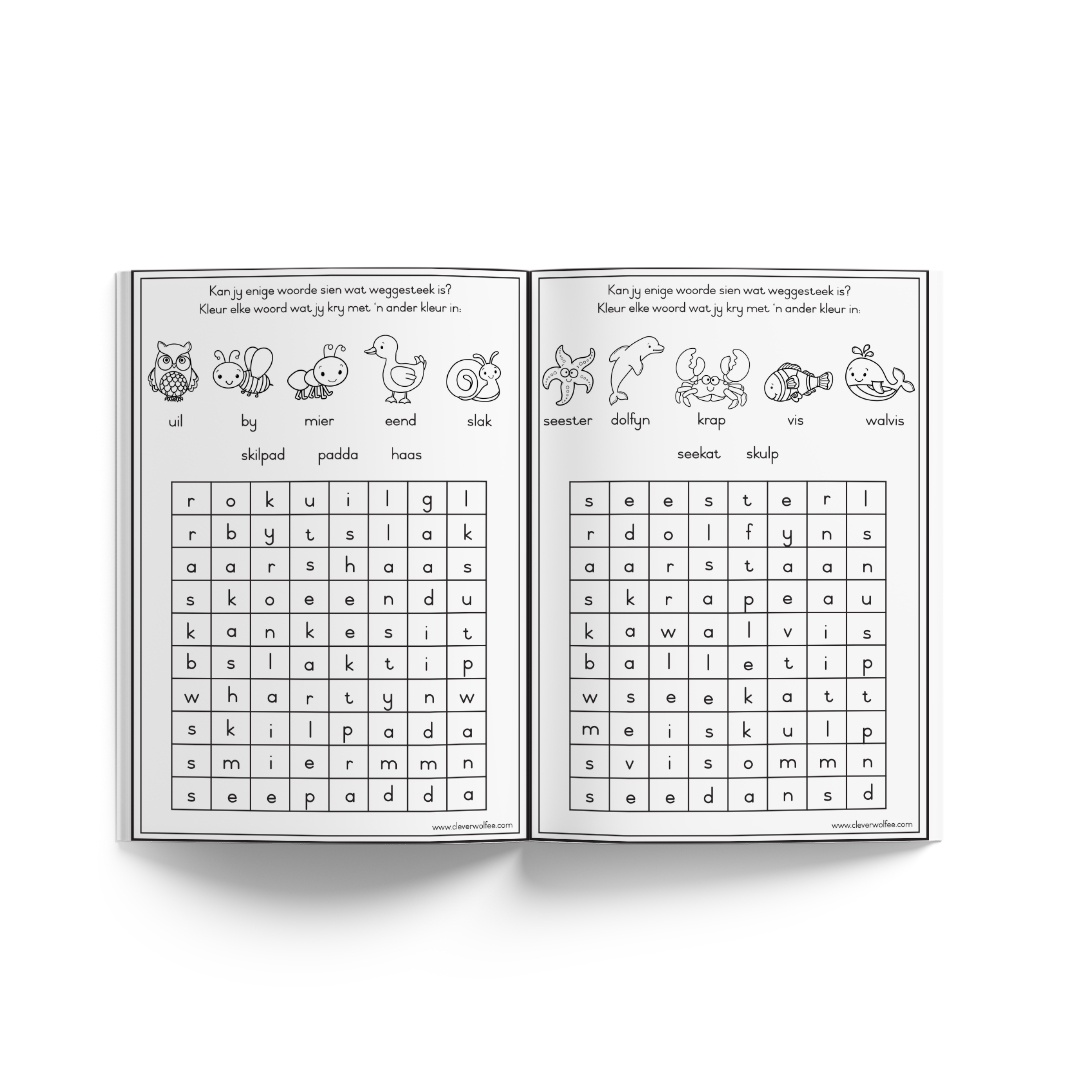 Hierdie boekie het 10 bladsye en ongeveer 70 woorde om te soek.