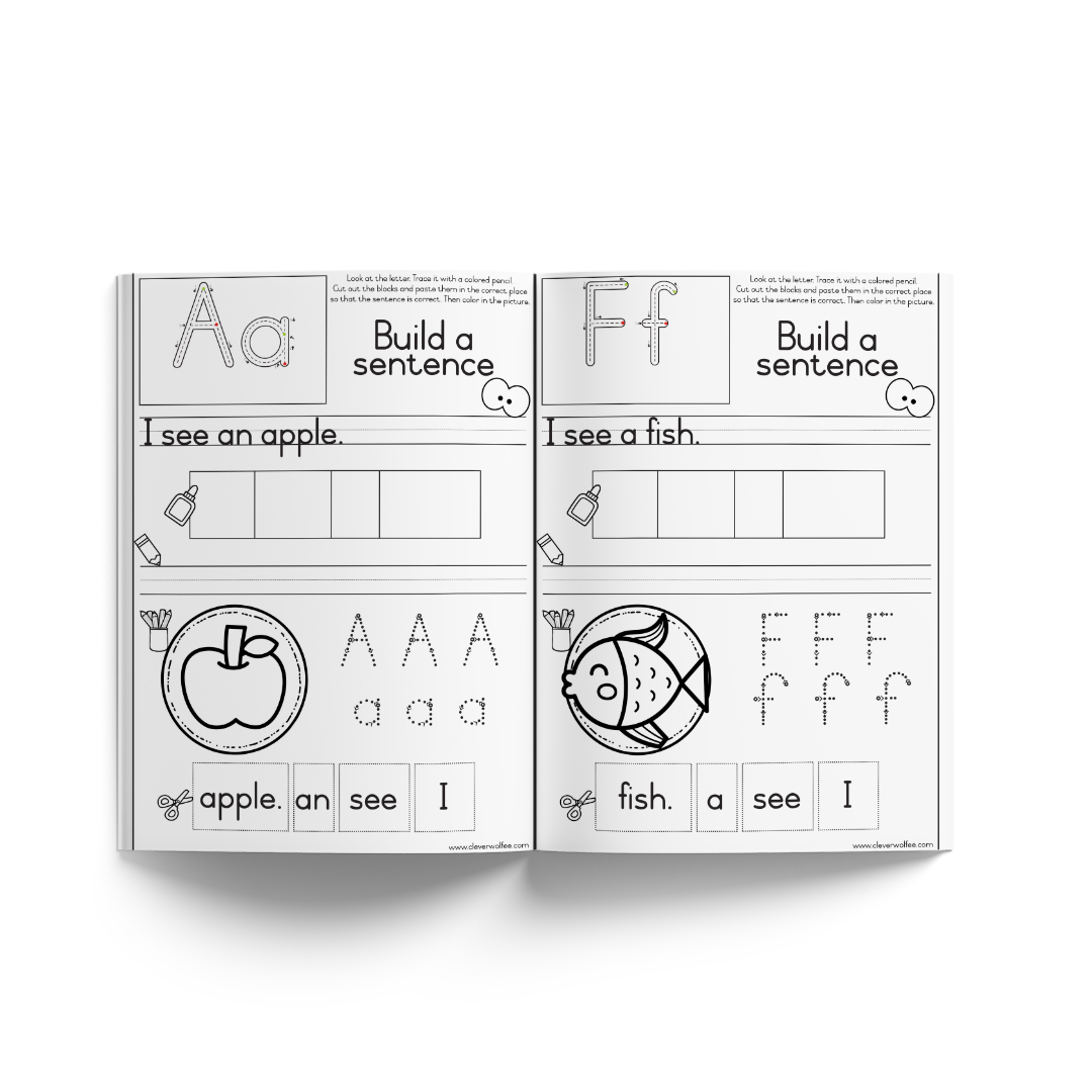 Each page focuses on one letter of the alphabet. Learners trace the letter, read a simple sentence, and then cut out the words and rebuild the sentence in the correct order. After completing the sentence, they colour the matching picture.