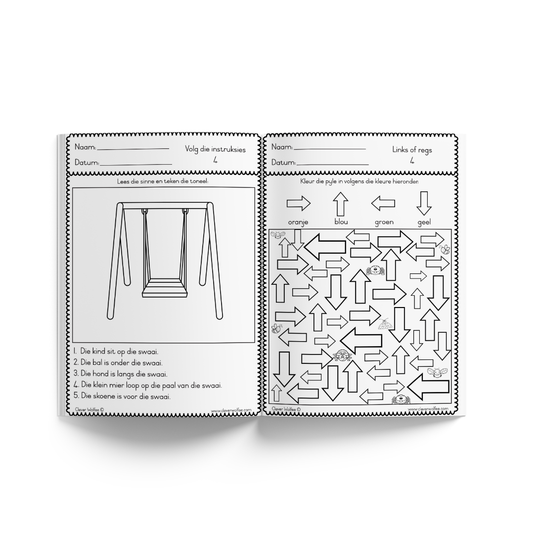 Hierdie boekie sluit 10 pret bladsye met aktiwiteite in om jou kind se vermoëns te toets om instruksies te volg en ook te onderskei tussen links en regs.